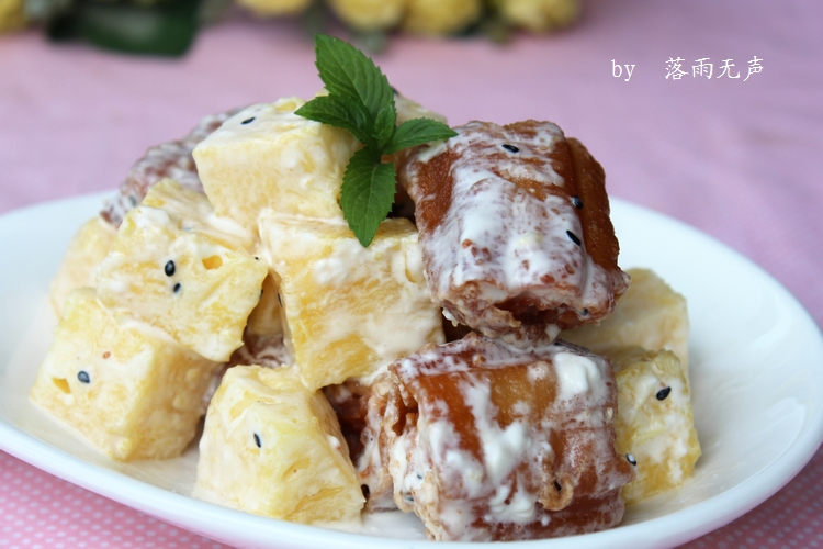 6、倒入炸好的油条和菠萝块拌匀即可