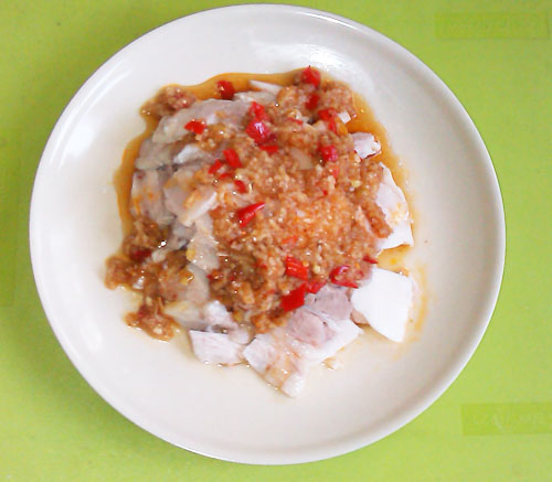 7、将做好的蒜泥剁椒混合调料淋在肉片上就好喽