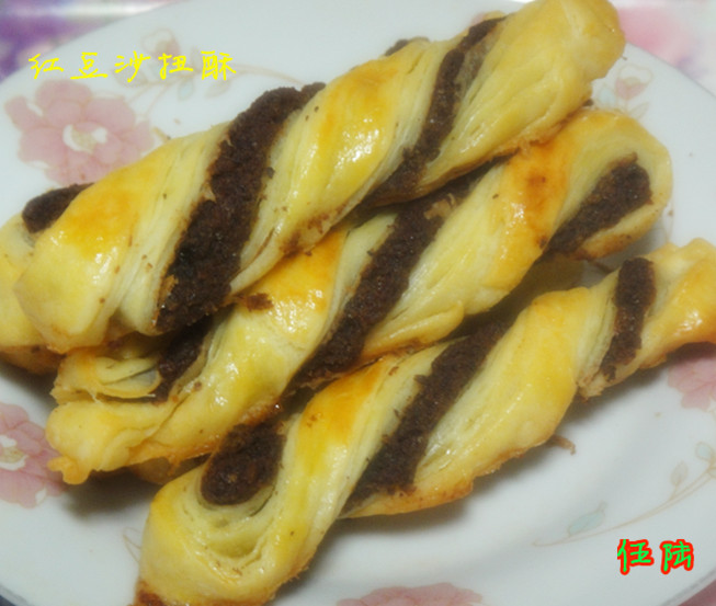 及以下步骤:烤制好的成品。 面粉造窝,加入鸡蛋、猪油、白砂糖、水、盐和成光滑面团。 放冰箱冷藏30分钟,取出并用擀面杖将面团擀成长方型薄片。 面粉造窝,加入鸡蛋、猪油、白砂糖、水、盐和成光滑面团。 放冰箱冷藏30分钟,取出并用擀面杖将面团擀成长方型薄片。 切二片黄油(约50克)摆放到面片上,对折,并把四周封紧。 面片擀薄,再把两头同时向中间对折,重复三次,放冰箱中冷冻20分钟。 冷冻好的面片略为擀薄,1/2空间铺上红豆沙(外围留约1厘米勿铺红豆沙),对折并略为压实。 横刀切成约2厘米宽的条状,拉住二头,同时向相反的方法扭动成麻花状,表面刷上蛋黄液(注意分层及豆沙处不要刷蛋黄液)。烤箱预热190度(上全下半),烤约15分钟。 烤制好的成品。