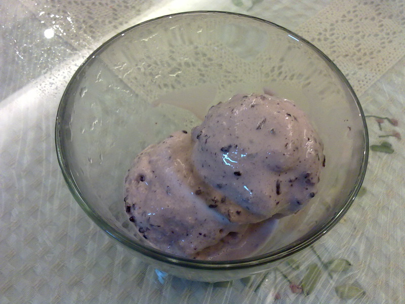 7、血糯米冰淇淋液冷冻到开始结冰以后,取出来,用电动打蛋器搅打片刻,重新放入冰箱。之后,每隔半个小时取出来搅打一次。重复这个过程,搅打4次以上,再将冰淇淋彻底冻硬,血糯米冰淇淋就做好了。(由于是晚上做的,只考虑了速度,所以照片拍少了,只能上张效果图)