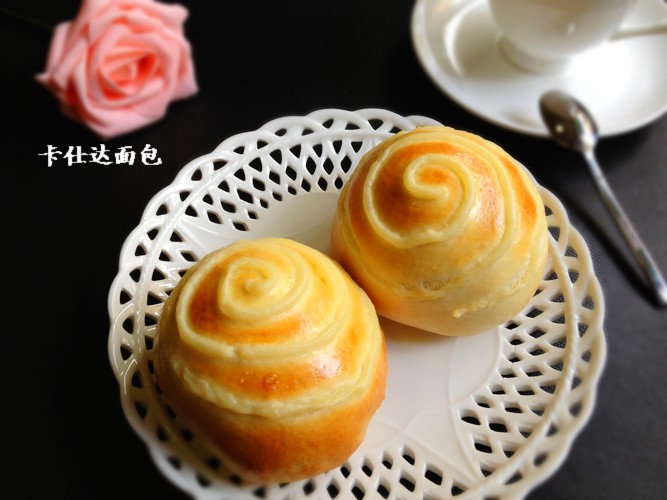 及以下步骤:现在制作面团。面团材料中除黄油外,搅拌出筋后,加入黄油。 揉至扩展阶段,即可以拉出薄膜状。 温暖处发2倍大。 排气,分割8份,滚圆 ,松弛15分钟。 将面团擀成圆饼形,翻面包入适量的卡仕达蛋奶酱,收口捏紧,整成圆形,收口朝下。 摆入烤盘,最后发酵。 多的卡仕达蛋奶酱装入裱花带。 最后发酵2倍大后,在面团表面刷上蛋液后,裱出花纹即可。 中层,170度,20分钟左右。 中层,170度,20分钟左右。
