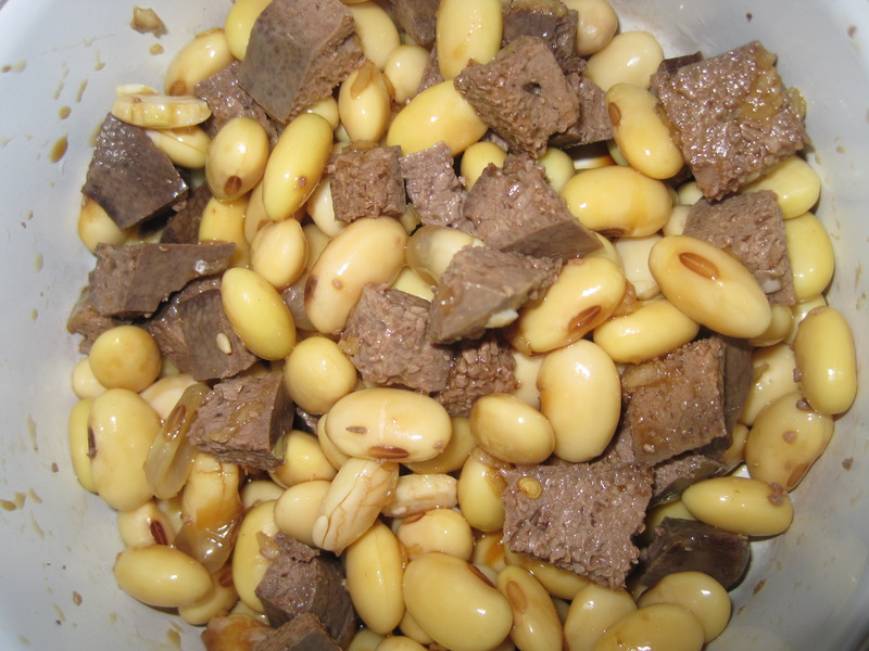 4、拌:将黄豆倒在猪肝顶上-再将调料浇在黄豆上-拌匀即可食用