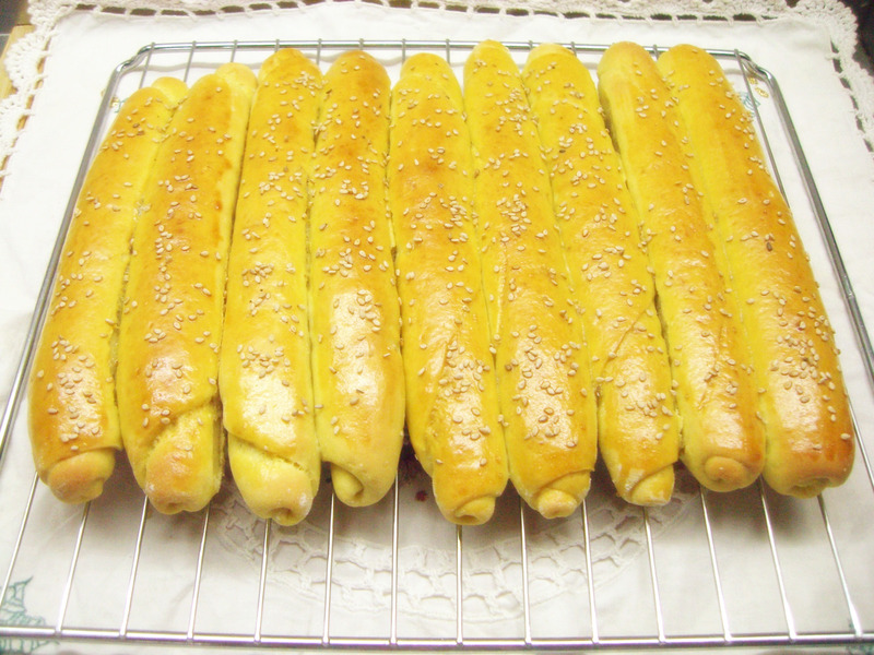 及以下步骤:搓成条状,其他面团依次卷好排入烤盘内,之间均匀的留点缝隙;放温暖湿润处进行最后发酵。 发酵至2倍大。 发酵结束,面包表面刷蛋液,撒白芝麻。 入预热180℃的烤箱,中下层、上下火,18分钟。 。 取一面团擀成椭圆形。 自上而下卷起,捏紧收口处。 。 搓成条状,其他面团依次卷好排入烤盘内,之间均匀的留点缝隙;放温暖湿润处进行最后发酵。 发酵至2倍大。 发酵结束,面包表面刷蛋液,撒白芝麻。 入预热180℃的烤箱,中下层、上下火,18分钟。 。