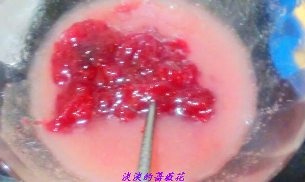 6、鱼胶粉用冷水隔水加热法。(也可以用吉利丁片,就是一个粉,一个片),但是粉容易在水里结块。所以要隔水加热融化比较好,直接冲热水进去,一定会结块。将草莓酱倒入调好的鱼胶糊中,拌匀。
