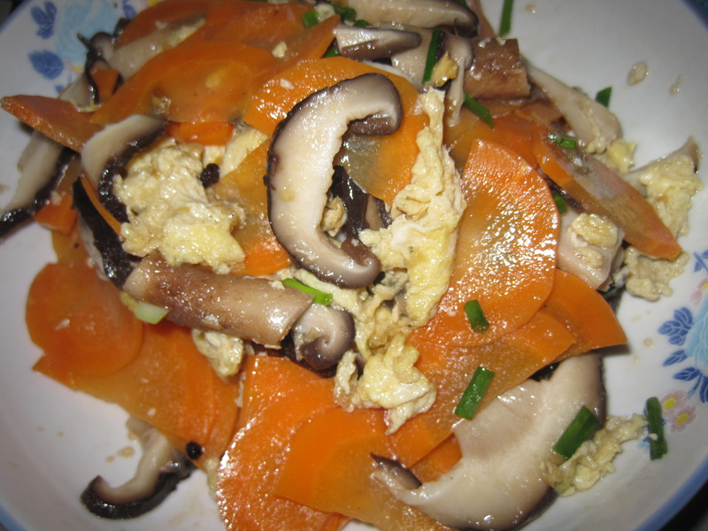 及以下步骤:准备食材:香菇洗净切成薄片-开水锅中焯30秒钟-捞出过冷水-挤干水分;胡萝卜:切成薄片如图-焯20秒-过冷水捞出沥干水分;鸡蛋两个-像做西红柿炒鸡蛋一样将鸡蛋打散、炸熟、弄成均匀的小块; 准备调料:香葱洗净切成大一点的葱碎;蒜2瓣捣成蒜泥-加生抽腌制一会; 准备食材:香菇洗净切成薄片-开水锅中焯30秒钟-捞出过冷水-挤干水分;胡萝卜:切成薄片如图-焯20秒-过冷水捞出沥干水分;鸡蛋两个-像做西红柿炒鸡蛋一样将鸡蛋打散、炸熟、弄成均匀的小块; 准备调料:香葱洗净切成大一点的葱碎;蒜2瓣捣成蒜泥-加生抽腌制一会; 准备食材:香菇洗净切成薄片-开水锅中焯30秒钟-捞出过冷水-挤干水分;胡萝卜:切成薄片如图-焯20秒-过冷水捞出沥干水分;鸡蛋两个-像做西红柿炒鸡蛋一样将鸡蛋打散、炸熟、弄成均匀的小块; 准备调料:香葱洗净切成大一点的葱碎;蒜2瓣捣成蒜泥-加生抽腌制一会; 准备食材:香菇洗净切成薄片-开水锅中焯30秒钟-捞出过冷水-挤干水分;胡萝卜:切成薄片如图-焯20秒-过冷水捞出沥干水分;鸡蛋两个-像做西红柿炒鸡蛋一样将鸡蛋打散、炸熟、弄成均匀的小块; 准备调料:香葱洗净切成大一点的葱碎;蒜2瓣捣成蒜泥-加生抽腌制一会; 准备花椒油:炒锅中放橄榄油少许-烧至5成热放入10粒花椒炸至花椒开始冒烟-关火将花椒粒捞出不用 凉拌:将胡萝卜片放在香菇片上-将香葱碎放在胡萝卜片上-将刚刚做的花椒油趁热泼在香葱上-将生抽腌好的蒜泥浇在上面-放一勺耗油拌匀-最后根据需要放或不放盐-拌匀即可食用。