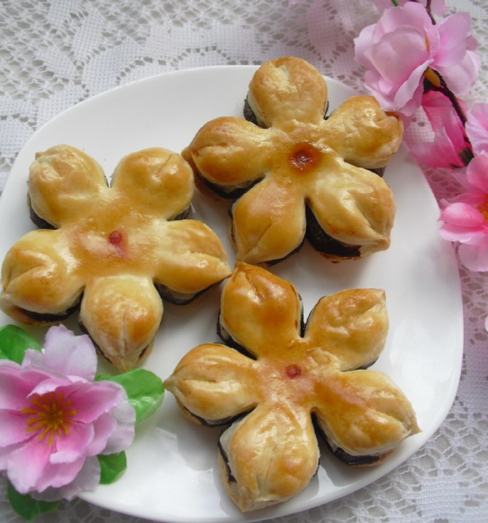 及以下步骤:将35克豆沙放入,包好,收好口,再将收口向下。 用手掌边压边转,将面团摁成中间薄,四周厚的饼饼。用刀片分成5等份,每一份的中间再切开。 每两个切口捏在一起,花瓣就出来了。 表面刷蛋黄液,烤箱预热,上火240°,下火200°,烤制20分钟即可。 梅花朵朵开。 将35克豆沙放入,包好,收好口,再将收口向下。 用手掌边压边转,将面团摁成中间薄,四周厚的饼饼。用刀片分成5等份,每一份的中间再切开。 每两个切口捏在一起,花瓣就出来了。 表面刷蛋黄液,烤箱预热,上火240°,下火200°,烤制20分钟即可。 梅花朵朵开。