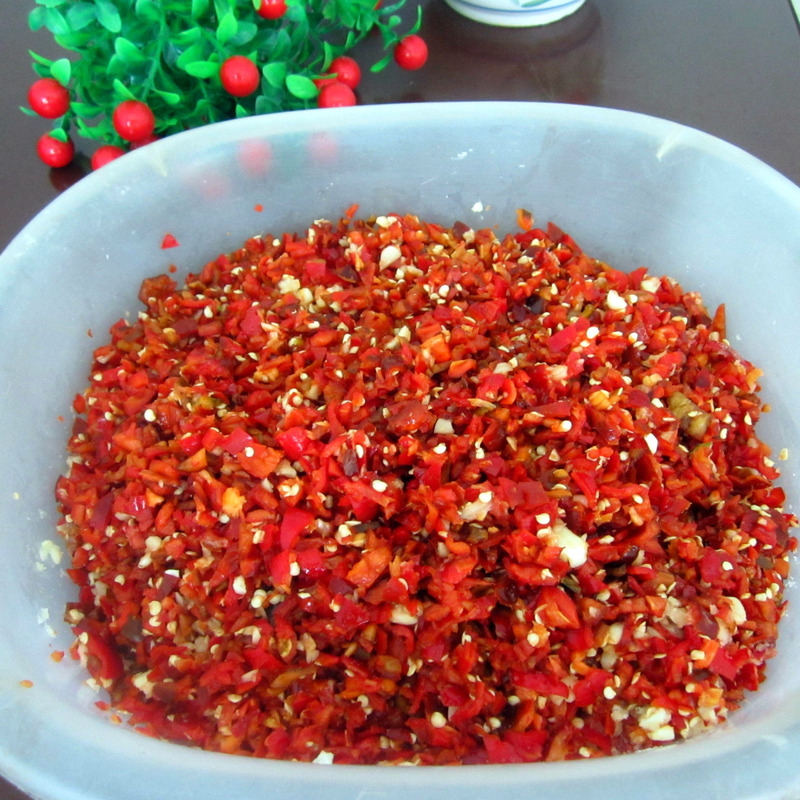 食材,红辣椒5斤,蒜瓣1斤,盐半斤,高度白酒半斤,白糖半斤。 腌菜酝子1个, 方法; 1、先将辣椒洗干净,晾干水!(一定要晾干!) 2、蒜瓣去皮凉干, 3、菜刀和砧板也洗干净,晾干,然后将辣椒和蒜分别剁碎, 4、将剁好的辣椒装盆里,放上剁好的蒜米, 5、然后撒盐,盐的多少,没有一个更准却的数字,可以尝一点点,味道就象是比平时做菜的盐味还咸一点就可以了。 6、加高度酒,不用放太多,多了辣椒酱的汁就比较多一点,适量放一点就可以了。 7、搅拌均匀后再加适量的白糖拌匀。 8、最后装进菜酝里盖好酝盖,在酝子外边放适量的清水,如图。 放在阴凉处十五天后即可开酝。 吃面的时候放一点,做菜的时候调一勺,很香很开胃的。 注意: 整个制作过程中一定不能用有水或者油的东西,而且材料也不能带有水哦,不然的话整酝菜就会坏掉哦,白费功夫。辣椒一定要凉干,可以多凉一天没关系。
