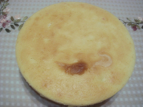 因为我是刚开始用家里新买的烤箱学着做这个蛋糕,所以对于烤箱温度把握得还不是很准,尚处于摸索阶段。本来是想做个蛋糕来着,结果配料弄的少了,模子(8寸的)选的大了,烤出来就成饼状了。而且我觉得调的温度有点高,成品很干啊~ 所以我的方子还是得改一改,下次继续做这个