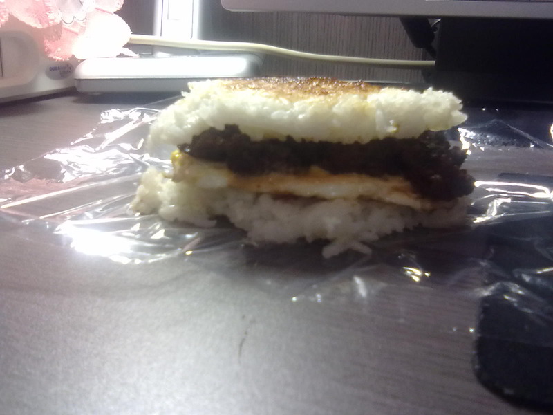 看到肯德基的早餐袋子上写着早餐必须要有谷类、肉类、蛋类和蔬菜水果类,又想起德克士的米汉堡,决定自己做一个。因为家里没有菜叶了,我这次做的就没有菜了,可以根据自己的口味放些生菜或白菜。老少咸宜哈~~(ps:原本没打算传上来的,所以制作过程的图片就没了,不过很简单,大家见谅哈~)