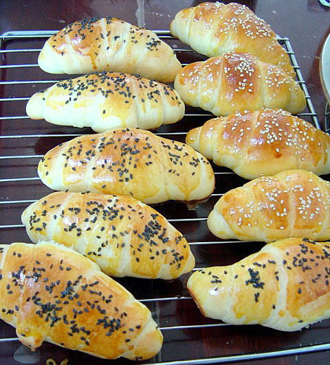 及以下步骤:面板上放干面粉 将面团取出后用手揉出里面的气体(如果面团太稀可适当揉些干面进去) 将揉好的面团等分成18份(最好使用电子称等分)我这个面团是940克 揉一揉成小面团后 盖上保鲜膜 放在常温醒发15分钟 准备烤箱,在烤盘上抹油(不要太多油,是为了拿起面包的时候方便 和成品的口感无关) 有手将面团搓成胡萝卜形 再擀平 从大头的一端开始卷成卷 放入烤盘(面团的小尖压在下边 每个面团之间要留足够的空间) 在烤箱里喷些水,烤箱开80度(比100度刻度稍微低点的位置) 10分钟 进行二次发酵。(如果室温低 1小时后可再开10分钟) 当面团变成原来3倍大的时候 就可以拿出来刷蛋黄液了,喜欢的也可以撒上些芝麻 放入预热好的烤箱180度 中层 烤12分钟 烘焙总结篇:(1)烘焙西点的时候所使用的酵母 尽量不要使用家里平时发馒头蒸包子所用的普通酵母,要使用专门耐糖的酵母比较容易成功。还要注意酵母有没有过期(2)因为气温的不同 所以发酵面团的时间有所不同 尽量放在暖和的地方比较好发 (我这个一次发酵的时候就是在面包机上盖了棉垫子) 这两次的发酵过程可能很长 大家不要着急 做这个面包不是一气呵成来做的 有点做作停停的感觉 一定要发到我说的程度才可以进行下个步骤 要不成品就很容易失败 变成馒头口感了 (3)没有奶粉可以不放 但是别用牛奶找 也就是说不要随便增加牛奶的用量(其它材料也一样)如果只是用水来代替牛奶要适当减少用量