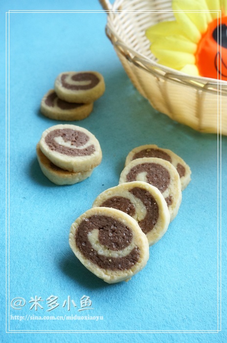 及以下步骤:一点一点往前卷,同时压紧; 卷好后,放入冰箱冷藏3小时至硬; 切成1.2cm厚的饼干坯子,修剪的边角料可以拿来混合做成大理石花案的。 烤箱170度预热,我是小烤箱,所以放在上面数下来第二层,离上火近些,15-20分钟左右,最后在烤箱里焖10分钟左右即可。 取一半的团加入可可粉,也揉捏成团; 两个颜色的团分别擀成薄片,擀的时候底下垫上保鲜膜方便操作,修整成长方形薄片后,把可可面片放在浅色面片上面,可可的保鲜膜可以撕掉了,保留底下的膜方便卷制。 一点一点往前卷,同时压紧; 卷好后,放入冰箱冷藏3小时至硬; 切成1.2cm厚的饼干坯子,修剪的边角料可以拿来混合做成大理石花案的。 烤箱170度预热,我是小烤箱,所以放在上面数下来第二层,离上火近些,15-20分钟左右,最后在烤箱里焖10分钟左右即可。