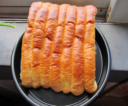 港式排包,也叫牛奶排包,但我的是奶油排包了,因为我是为了消耗奶油才做的,放了大量的淡奶油,很松软。放了一晚上,就皱成上面那样了。最近做的面包都很柔软,基本上一晾凉就皱了。