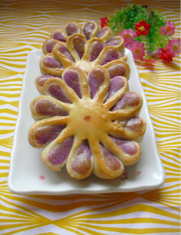 及以下步骤:将紫薯洗净、切片,蒸熟,晾凉后捣成泥,加入绵糖和生粉做成馅,分成35克一个。 包入紫薯馅,收口向下,用手轻压成一个圆饼,用刀片切开,注意中间部分不要切断,而且要切均匀。 沿着同一方向往上翻成花瓣状。 刷蛋黄液,烤箱180度预热,中层20分钟左右。 将卷卷竖放,边口向上,将擀面杖放在中间,向上擀一下,向下擀一下,再次卷起来。 摁一下中间位置,将面卷的两头向中间捏,摁扁,上下左右擀两下后,接着只要擀一下边边。 将紫薯洗净、切片,蒸熟,晾凉后捣成泥,加入绵糖和生粉做成馅,分成35克一个。 包入紫薯馅,收口向下,用手轻压成一个圆饼,用刀片切开,注意中间部分不要切断,而且要切均匀。 沿着同一方向往上翻成花瓣状。 刷蛋黄液,烤箱180度预热,中层20分钟左右。