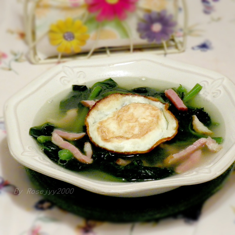 及以下步骤:从田里摘下的潺菜,洗净; 炉上置锅,火腿切丝,放入锅里慢火熬20-30分钟; 从田里摘下的潺菜,洗净; 炉上置锅,火腿切丝,放入锅里慢火熬20-30分钟; 从田里摘下的潺菜,洗净; 炉上置锅,火腿切丝,放入锅里慢火熬20-30分钟; 在熬汤的同时可以腾出手来煎蛋,先煎一面; 再煎另一面,因不是做早餐或做太阳蛋,所以另一面也要稍煎一煎; 火腿熬好后水是开着的,放入潺菜,用勺子翻几下,点放精盐和撒少许胡椒粉,滴几滴麻油; 把蛋放在面上滚几滚可上盆食用。