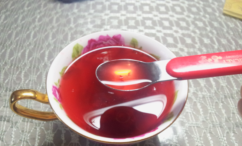 4、泡好后用勺子压一压,按一按,把杨梅按压扁,使杨梅的汁水溢出。