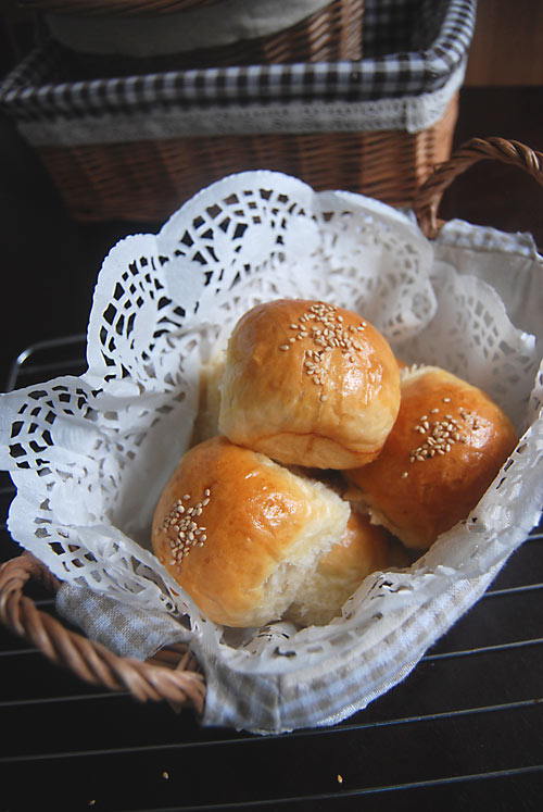 7、放温暖湿润处二次发酵约40分钟,表面刷蛋液,撒上少许白芝麻