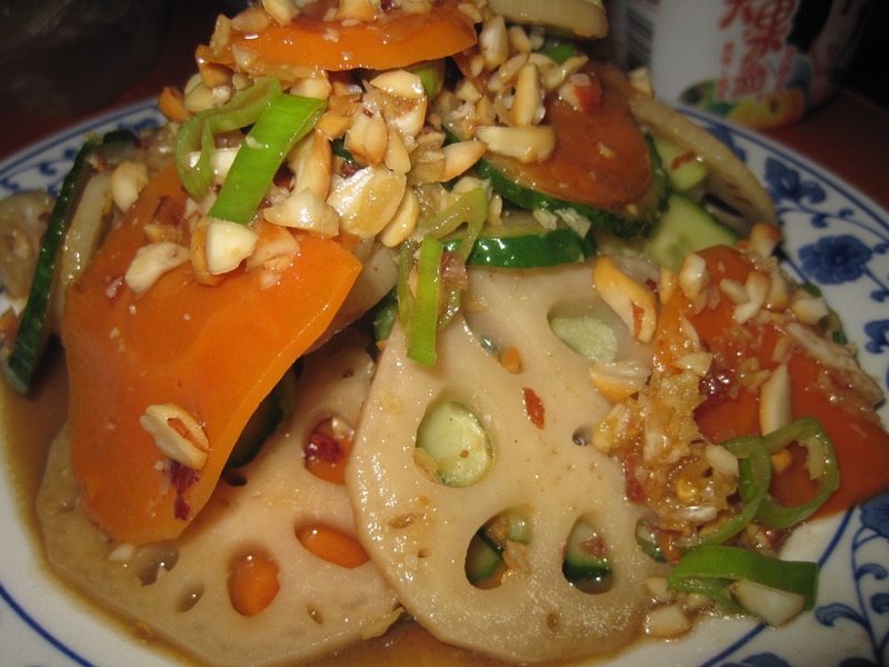 及以下步骤:锅中放橄榄油少许,放入花椒粒炸至变黑弃之不用,迅速浇在事先准备好的食材上的花椒面和葱末上,放盐少许,耗油1羹匙搅拌均匀,最后放上花生碎搅拌均匀即可食用哦 藕切薄片,开水焯一下过冷水捞出备用 黄瓜切薄片备用 藕切薄片,开水焯一下过冷水捞出备用 黄瓜切薄片备用 胡萝卜切薄片焯一下捞出过冷水备用。未拍照,忙不过来了呵呵 锅中少许油将花生炸熟,凉凉用刀剁成碎 蒜捣成蒜泥,用生抽腌制一会 将藕片、胡萝卜片、黄瓜片掺在一起,放一羹匙辣椒面葱末,在最上面 锅中放橄榄油少许,放入花椒粒炸至变黑弃之不用,迅速浇在事先准备好的食材上的花椒面和葱末上,放盐少许,耗油1羹匙搅拌均匀,最后放上花生碎搅拌均匀即可食用哦