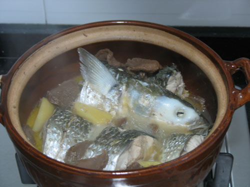 6、生姜剥皮切块;萝卜干切一片片。把乌头鱼放近锅里,加生姜块、萝卜片,两勺生抽,一茶匙盐粉,倒入食用水。