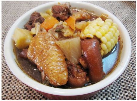 及以下步骤:再炖10分钟即可。 成品出炉。 将猪蹄剁开洗净,排骨鸡翅也洗净,过水沥干。 准备葱段,姜片、耗油和两个茶包,一个装八角、甘草、香叶、花椒,另一个装普洱茶。 将过好水冲干净的猪蹄喝排骨倒入锅中(不放鸡翅)倒入清水没过表面,大火加热沸腾后,如有浮沫,用勺子撇去,加入葱段跟姜片、两个茶包,盖上盖炖煮35分钟。 35分钟后这会儿可以把冲干净的鸡翅放进去,在炖20分钟。 最后倒入胡萝卜、白萝卜、土豆、耗油。 适量的加点盐。 再炖10分钟即可。 成品出炉。