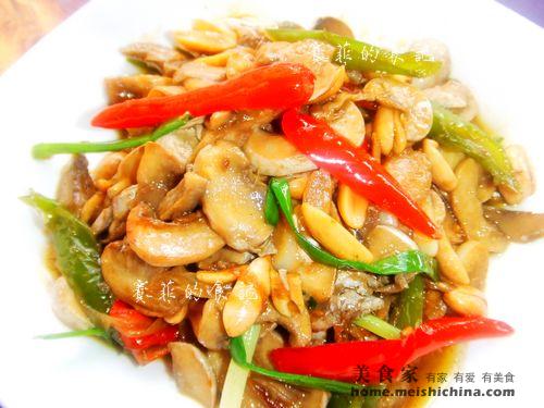 6、待炒蘑菇溢出的水份收干时放入酒鬼花生,炒制均匀。