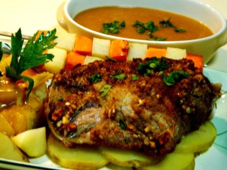 3、用接盘里的汤汁来制作蘸料,味道最好!最好不要另外再勾兑酱汁,原汁原味才好吃。土豆胡萝卜这些蔬菜不要浪费,烤好后把它切块,做为烤羊腿的配菜吃米饭最香。