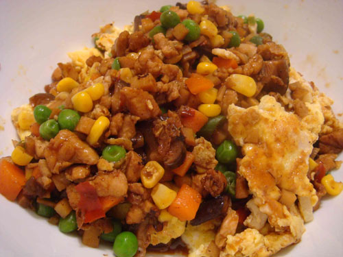 料酒(适量) / 盐(适量) / 糖(适量) / 葱(适量) / 姜(适量) / 香油(适量) / 鸡蛋(三个) / 蒜(适量) / 淀粉(适量) / 醋(适量) / 老抽(适量) / 香菇(两朵) / 蚝油(适量) / 木耳(若干) / 笋(一块) / 辣豆瓣酱(适量) / 各色蔬菜(适量)