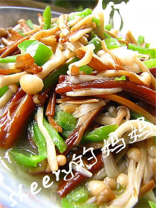 及以下步骤:金针菇剪去老根,洗净后切成段,青椒摘去蒂、洗净后切成丝。 锅内放点油烧热。 金针菇剪去老根,洗净后切成段,青椒摘去蒂、洗净后切成丝。 锅内放点油烧热。 金针菇剪去老根,洗净后切成段,青椒摘去蒂、洗净后切成丝。 锅内放点油烧热。 放入青椒丝翻炒。 青椒丝快要发蔫时,放入金针菇段一起翻炒。 加糖、盐、鸡精快速翻炒片刻。 一盘清清爽爽、漂漂亮亮的金针菇就可以上桌了。