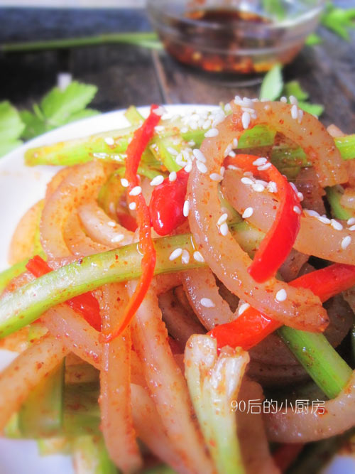 这个菜绝对是会让人吃了停不了的香辣菜哦~ 肉皮的弹牙爽脆中带着嚼劲,融合了芹菜的鲜香和辣椒酱的香辣,真是越吃越有味道~超级过瘾! 最重要的是,猪皮美容,芹菜还瘦身。 呵呵,不配饭拿去下酒也非常适合啊~