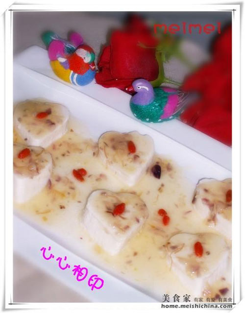 及以下步骤:将鲍鱼瑶池汁淋在豆腐上,把枸杞装饰在上即可。 成品图@@来品尝吧。 祝大家永远幸福快乐。 用心形模型按压在豆腐上,成心形豆腐,盛入碟里。 锅热油,爆香葱出味,倒入适量的鲍鱼瑶池汁 。 稍微烧开后。 浇入生粉水勾芡,即可出锅。 将鲍鱼瑶池汁淋在豆腐上,把枸杞装饰在上即可。 成品图@@来品尝吧。 祝大家永远幸福快乐。