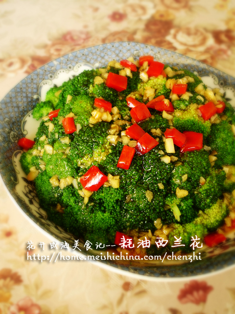 及以下步骤:加一滴油(这样焯水后的西兰花颜色会更加鲜艳)。 水烧开后将西兰花放入锅里焯十几秒,颜色变绿立即捞出过一下冷水。 (焯水的时间要控制好,时间不宜长!) 控净水分,开始摆盘。 (一定要控净水分!不然浇上蚝油汁的时候会把味道冲淡一些)。 找一个大碗,西兰花根朝上 菜花朝底下均匀的摆摆,摆完在上面放比碗大一些的盘子倒扣过来即可成形。 倒扣过来后的样子。 锅中倒油,炒香蒜末和尖椒。 倒入调料汁慢慢烧开。 调料汁烧开后沿着锅边倒入水淀粉。 熬至粘稠状态即可关火,浇在摆好的西兰花上。 熬至粘稠状态即可关火,浇在摆好的西兰花上。