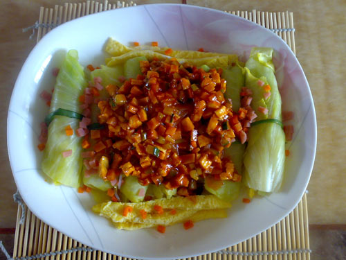 及以下步骤:轻轻卷起来,用葱叶捆一下。 将包好的包菜卷放入容器中,撒上火腿丁和胡萝卜丁。 将余下的黄瓜,胡萝卜,鸡蛋,火腿等切成丁,葱切末。 锅中放少量油, 倒入葱末和切好的蔬菜火腿丁翻炒。 加入适量蚝油和番茄酱,倒入少量水烧开。 最后将做好的酱汁倒在包菜卷上。 将余下的黄瓜,胡萝卜,鸡蛋,火腿等切成丁,葱切末。 锅中放少量油, 倒入葱末和切好的蔬菜火腿丁翻炒。 加入适量蚝油和番茄酱,倒入少量水烧开。 最后将做好的酱汁倒在包菜卷上。