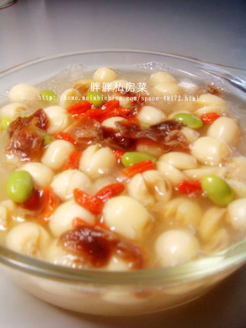 及以下步骤:桂元肉、枸杞用温水洗净,泡5分钟滗去水分。 炒锅置中火,放入清水500克,再放入冰糖烧沸,待冰糖完全溶化,端锅离火。用筛子滤去糖渣,再将冰糖水倒回锅内。 放入桂圆肉和枸杞。 再放入青豆。 大火煮开即可。 将蒸熟的莲子滗去水,盛入大汤碗内,再将煮开的冰糖及配料一起倒入汤碗,莲子浮在上面即成。 放入桂圆肉和枸杞。 再放入青豆。 大火煮开即可。 将蒸熟的莲子滗去水,盛入大汤碗内,再将煮开的冰糖及配料一起倒入汤碗,莲子浮在上面即成。