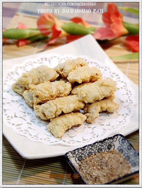 及以下步骤:搅匀后再倒入少许香油拌匀备用。 把腌好的肉片逐一沾好酥炸糊,然后下入四成热的油锅中进行炸制。 用中小火把肉片炸熟后捞出,然后提高油温再复炸一遍。 炸好后把肉码盘,上桌时配以椒盐即可。 调制酥炸糊;先往蛋清里倒入稍稠一些的水淀粉搅匀。 然后倒入适量干面粉搅匀。 搅匀后再倒入少许香油拌匀备用。 把腌好的肉片逐一沾好酥炸糊,然后下入四成热的油锅中进行炸制。 用中小火把肉片炸熟后捞出,然后提高油温再复炸一遍。 炸好后把肉码盘,上桌时配以椒盐即可。