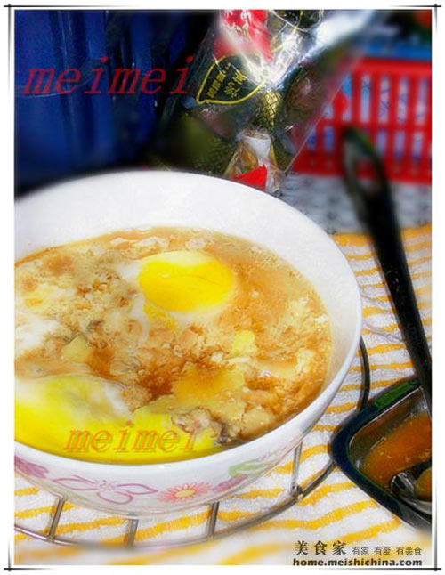 7、打入两粒蛋在肉上。