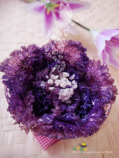 羽衣甘蓝营养丰富,含有大量的维生素a、c、b2及多种矿物质,特别是钙、铁、钾含量很高,铁、钙、钾含量是普通甘蓝的三倍以上,其中维生素c含量非常高,是治疗儿童夜盲症和补钙的首选蔬菜。每100克嫩叶中维生素c含量达到153.6~220毫克,在甘蓝中可与西蓝花媲美。其热量仅为209焦耳,是健美减肥的理想食品。 把羽衣甘蓝做成情人花送给老公,代表着我对他的爱恋。想不想用菜做成花束送给他呢?你也可以试试~~