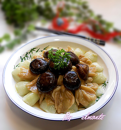 及以下步骤:热油锅,把蒜,姜和八角爆香,放入冬菇和鸭掌朝片刻。 放入鸡汤,清水,蚝油,生抽,料酒和糖烧开。 转中小火烧约30分钟至鸭掌软烂。 用淀粉水勾芡。 小白菜烫熟。 把材料码盘,淋上芡汁即可。 转中小火烧约30分钟至鸭掌软烂。 用淀粉水勾芡。 小白菜烫熟。 把材料码盘,淋上芡汁即可。