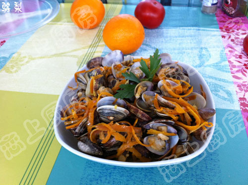 及以下步骤:当蛤蛎完全打开后,把蛤蛎捞起盛盘待用。 把橙皮丝倒入剩下的汤汁加入胡椒粉关小火收汁 把收好的汤汁淋在盛好的蛤蛎上,就完成了。 锅加热倒入橄榄油,加入大蒜和葱头爆香。 放入萝卜丝和月桂翻炒一下 倒入蛤蛎翻炒 倒入橙汁让蛤蛎完全打开 当蛤蛎完全打开后,把蛤蛎捞起盛盘待用。 把橙皮丝倒入剩下的汤汁加入胡椒粉关小火收汁 把收好的汤汁淋在盛好的蛤蛎上,就完成了。