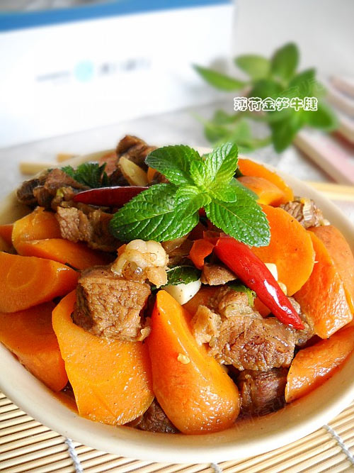 薄荷营养丰富,春夏季可采其嫩茎食用.炒食或用开水烫后凉拌,清香可口,尤其是夏季用其嫩叶和其他果蔬榨汁饮用,是去暑化浊的佳蔬。还可以凉拌炒肉丝、调羹汁、做馅料等,像其他蔬菜一样食用。古人云:作膳久食,补肾气,辟邪毒,除秽气,令人口气香清。 胡萝卜,有金笋之称。是一种质脆味美、营养丰富的家常蔬菜。中医认为它可以补中气、健胃消食、壮元阳、安五脏,治疗消化不良、久痢、咳嗽、夜盲症等有较好疗效,故被誉为东方小人参,所含的营养素很全面。 牛肉是中国人的第二大肉类食品,仅次于猪肉,牛肉蛋白质含量高,而脂肪含量低,味道鲜美,受人喜爱。 牛肉含有丰富的蛋白质,氨基酸组成比猪肉更接近人体需要,能提高机体抗病能力,对生长发育及手术后、病后调养的人在补充失血、修复组织等方面物别适宜。牛肉有补中益气、滋养脾胃、强健筋骨、化痰息风、止渴止涎的功效。 薄荷金笋牛腱,牛肉酥烂,胡萝卜吸足了牛肉的油脂,加上薄荷的清香,在炎炎夏日吃起来尤为清爽怡人······
