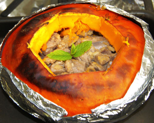 南瓜的大小和排骨的量可随着人数来决定,烤箱要根据各家的来调节烤制的时间。
