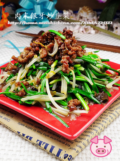 及以下步骤:不用另加油,直接放入豆芽煸炒。 加入木耳丝 盐煸炒均匀,炒至豆芽断生。加入鸡精调味。 关火,加入韭菜段,搅拌均匀,用余温把韭菜煸熟。 把炒好的银牙韭菜放入盘中。 再把炒熟的肉末浇在银牙韭菜上即可。 不用另加油,直接放入豆芽煸炒。 加入木耳丝 盐煸炒均匀,炒至豆芽断生。加入鸡精调味。 关火,加入韭菜段,搅拌均匀,用余温把韭菜煸熟。 把炒好的银牙韭菜放入盘中。 再把炒熟的肉末浇在银牙韭菜上即可。