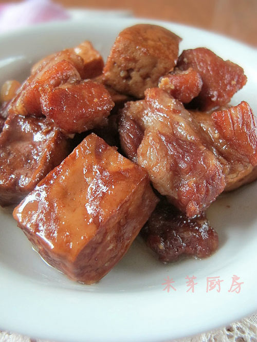 7、再下酱豆干,如果你喜欢吃那种比较软的,就在肉烧至六、七成熟(大概烧40分钟左右的样子)再放酱豆干也可。