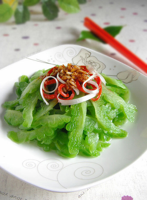 及以下步骤:把蒜茸放入调料碗中,加入生抽、醋、白糖、香油搅拌均匀。 把苦瓜捞出稍微控干水分,摆入盘中,再放上红椒和葱白。 把调料汁淋在苦瓜上。 锅中烧热少许油。 把热油浇在蒜茸上,即可食用。 把蒜茸放入调料碗中,加入生抽、醋、白糖、香油搅拌均匀。 把苦瓜捞出稍微控干水分,摆入盘中,再放上红椒和葱白。 把调料汁淋在苦瓜上。 锅中烧热少许油。 把热油浇在蒜茸上,即可食用。