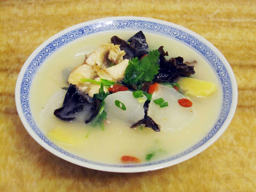 白萝卜和鱼的味道很合。 此汤特点和口感: 汤色浓白,口味鲜香。 此汤功用: 黑鱼:又称乌鳢、乌鱼、蛇皮鱼。用于脾虚水肿,脚气,小便不利;气血不足,经闭,久患疮疥等。 萝卜:味甘、辛、性凉,入肺、胃、肺、大肠经; 具有清热生津、凉血止血、下气宽中、消食化滞、开胃健脾、顺气化痰的功效。 黑木耳:补气养血,润肺止咳。有抗辐射,抗凝血,抗癌,降压,降血糖,降血脂及抗动脉粥样硬化的作用。 枸杞:滋补肝肾,益精明目。用于虚劳精亏,腰膝酸痛,眩晕耳鸣,内热消渴,血虚萎黄,目昏不明。有延缓衰老、抗脂肪肝、调节血脂和血糖、增强非特异性免疫作用。 适应人群: 一般人群均可食用。但孕妇不宜吃黑木耳。白萝卜忌与人参、西洋参同食。