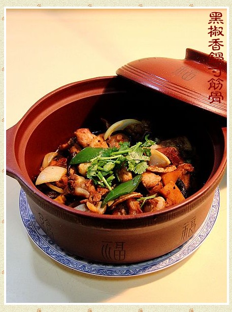 猪肋排肥瘦相间,吃起来香而不腻很多人都喜欢,但有时往往买回的肋排附带着许多软边的脆骨,也就是靠近猪胸部的软骨,其实这个部位的软骨很好吃,可以用它炒菜、焖、炖或煮汤都可以,软骨很有嚼头,嚼碎了吃还可以起到补钙的作用,因此切不可浪费。 软骨也称之为筋骨或脆骨,把它烧的够火候是很好吃的,可以连骨带肉一起下肚,呵呵!今天就用这一部位的软骨做道家常菜,里面配以黑胡椒汁和黑胡椒碎,入口后既香辣又不会上火,比辣椒的干辣要好多了,还略微带有一些西餐的味道,这道菜就叫做黑椒香锅寸筋骨,其做法如下;