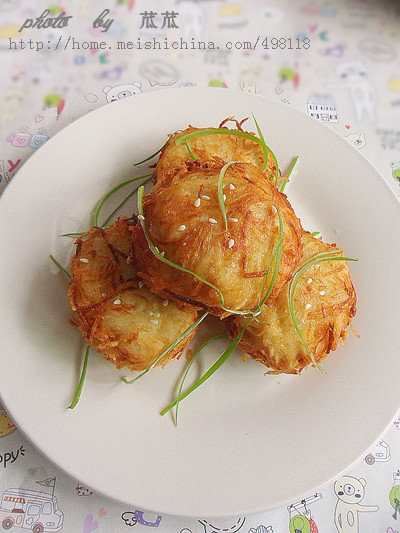 及以下步骤:用鸡肉末放在土豆丝上滚成球状。 锅内倒油,烧至五成热时,下入肉鸡肉球炸。 炸至金黄,酥脆时,出锅控油装盘。 肉末里加入鸡蛋1个,少许盐。 白糖适量。 料酒1勺。 土豆去皮后,用擦丝器擦成细丝状。 用鸡肉末放在土豆丝上滚成球状。 锅内倒油,烧至五成热时,下入肉鸡肉球炸。 炸至金黄,酥脆时,出锅控油装盘。