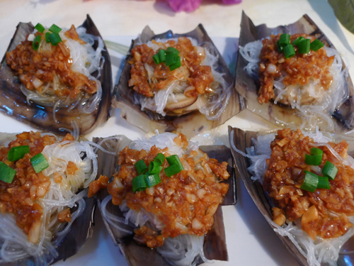及以下步骤:带子螺去一边的壳,为了装盘方便把尾巴的壳也去掉。只剩下盛着螺肉的那1/4。去掉肠,洗净反过来沥干水。一定要反过来沥干水。 粉丝用开水泡开切成2cm长的小段。 带子螺去一边的壳,为了装盘方便把尾巴的壳也去掉。只剩下盛着螺肉的那1/4。去掉肠,洗净反过来沥干水。一定要反过来沥干水。 粉丝用开水泡开切成2cm长的小段。 带子螺去一边的壳,为了装盘方便把尾巴的壳也去掉。只剩下盛着螺肉的那1/4。去掉肠,洗净反过来沥干水。一定要反过来沥干水。 粉丝用开水泡开切成2cm长的小段。 粉丝均匀地盘放于带子螺上。锅内的水烧开后放入大火蒸五分钟。(盖锅盖) 大蒜拍好剁碎。 大蒜置于小碗中,加入花生油及生抽。微波炉大火叮50秒。 把叮好的酱料均匀地置于各个带子螺上。再蒸两分钟。