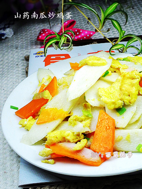 及以下步骤:山药和南瓜去皮,切成片。 把鸡蛋加入料酒打散备用。 山药和南瓜去皮,切成片。 把鸡蛋加入料酒打散备用。 山药和南瓜去皮,切成片。 把鸡蛋加入料酒打散备用。 把切好片的山药和南瓜焯水。 锅中放入油,烧热爆香葱碎,倒入打散的蛋液快速翻炒至蛋液凝固成块。 加入焯水的山药和南瓜皮翻炒均匀。 加入盐和鸡精调味即可。