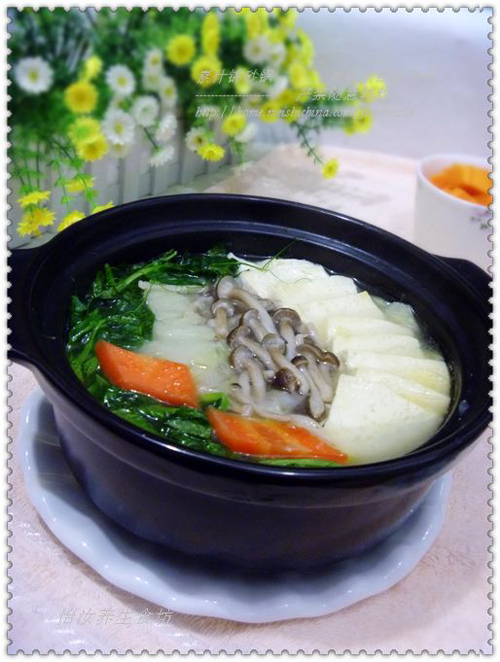 最近怡汝可能是休息的不好,有点上火了,每当这个时候,我都是要自己调理一下。今天就做个清补的汤调节一下,这款怡汝版的【砂锅素什锦】用的优质北豆腐、蟹味菇和豌豆尖、白菜和鸡汤。豆腐可以提供优质蛋白,蟹味菇可以润肠通而且使汤鲜美,豌豆尖可以清热解毒、白菜可以调理肠胃。此汤不但营养丰富,而且味道鲜美,富含蛋白和维生素,还可以清除体内热毒。 蟹味菇含有丰富维生素和17种氨基酸,其中赖氨酸、精氨酸的含量高于一般菇类,有助于青少年益智增高,抗癌、降低胆固醇。特别是子实体(即根以上部分)的提取物具有多种生理活性成份。其中真菌多糖、嘌呤、腺苷能增强免疫力,促进抗体形成抗氧化成分能延缓衰老、美容等等。 药用功效 蟹味菇(真姬菇)子实体中提取的β-1,3-d葡聚糖具有很高的抗肿瘤活性,而且从真姬菇中分离得到的聚合糖酶的活性也比其它菇类要高许多,其子实体热水提取物和有机溶剂提取物有清除体内自由基作用,是一种低热量、低脂肪的保健食品。 1、蟹味菇富含膳食纤维,能够起到润肠通便的功效,可以有效解决便秘问题,同时排除 体内毒 素,降低血清胆固醇; 2、蟹味菇中的维生素d含量也很丰富,有助于儿童补充钙质、强壮骨骼,促进儿童的发 育; 3、蟹味菇子实体的提取物具有多种生物活性成分,其中真菌多糖、嘌呤、腺苷能增强机 体免疫力,抵御癌细胞及多种病毒对人体的侵袭,强身健体,防癌、抗癌 4、蟹味菇的中的生物活性物质还能促进抗体形成抗氧化成分,起到延缓衰老、美容护肤 的功效。 蟹味菇一般人群均可食用,尤其适合便秘者、体弱的人群、癌症患者、心血管疾病患者以及发育期儿童食用。 豆腐的营养: 豆腐营养丰富,含有铁、钙、磷、镁等人体必需的多种微量元素,豆腐还含有糖类、植物油和丰富的优质蛋白,被称为植物肉。 豌豆尖营养和功效: 豌豆苗富含维生素a、维生素c、钙和磷等营养成分。此外,还含有大量的抗酸性物质,具有很好的防老化功能,有清热解毒的功效。 一般人群均可食用,尤其适用于热性体质的人食用。 白菜的营养和功效: 白菜是白菜之首,富含丰富的粗纤维,不但能起到润肠、促进排毒的作用又刺激肠胃蠕动,促进大便排泄,帮助消化的功能。对预防肠癌有良好作用。 尤其是秋冬季节空气特别干燥,寒风对人的皮肤伤害极大。白菜中含有丰富的维生素c、维生素e,多吃白菜,可以起到很好的护肤和养颜效果。