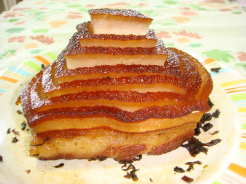 及以下步骤:烧锅了加水,香葱和大料,姜,酒,盐大火烧半小时之后熄火,闷两小时。 两小时之后开大火,将香葱捞起。 在把香葱大料捞起来以后大火烧开直至收汁。 烧好的五花肉,色泽鲜艳,光亮。让人垂涎欲滴。然后将它放入冰箱里冻半小时。 将冻好的五花肉取出来,顺着边沿切薄片,小心不要切断哦。 将切好的长条重新码回四方形。并用梅干菜垫底,放入蒸锅蒸两小时。 将蒸好的五花肉取出来,从顶上轻轻用尖头筷子挑起,让整块肉形成一个塔的形状。在做这个步骤时,比较费劲,因为技术不到家。不过,还是有点儿塔的形状。 将冻好的五花肉取出来,顺着边沿切薄片,小心不要切断哦。 将切好的长条重新码回四方形。并用梅干菜垫底,放入蒸锅蒸两小时。 将蒸好的五花肉取出来,从顶上轻轻用尖头筷子挑起,让整块肉形成一个塔的形状。在做这个步骤时,比较费劲,因为技术不到家。不过,还是有点儿塔的形状。