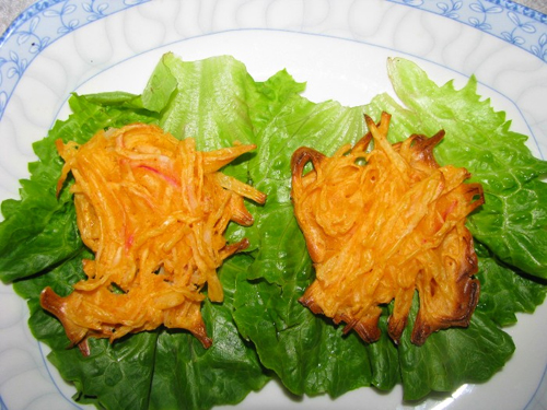相信大家从小就吃过妈妈炸的螃蟹。 还记得吗?妈妈炸螃蟹的原材料是鸡蛋、土豆和花椒叶,配料是面粉。 妈妈把土豆切成丝,和花椒叶拌在一起,裹上面粉糊,一勺勺舀进油锅里炸香、炸黄、炸脆,炸成一只只螃蟹,撒上盐巴辣子面,既麻又辣、有滋有味,比真螃蟹还要好吃! 小时候经常这样吃,长大以后,也自己会做了。 今天换个吃法,烤个萝卜螃蟹。